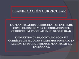 Este documento describe la importancia de la planificación curricular y de la enseñanza. Explica que la planificación curricular implica el diseño del currículum escolar en su totalidad, mientras que la planificación de la enseñanza se refiere a la implementación del currículum en el aula. Luego, detalla los principales elementos a considerar en la planificación de la enseñanza, como el programa de estudio, los recursos disponibles, el tiempo, las estrategias de motivación y las características de los estudiantes. Finalmente, en