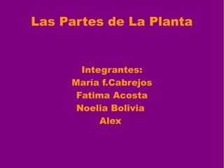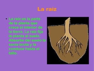 Las partes principales de una planta son la raíz, el tallo, las hojas, las flores y los frutos. La raíz crece hacia abajo en la tierra y fija la planta al suelo, absorbiendo agua y nutrientes. El tallo crece hacia arriba y soporta las hojas, flores y frutos. Las hojas realizan la fotosíntesis y otras funciones. Las flores contienen los órganos reproductivos y están formadas por pétalos y otras piezas. Los frutos protegen y dispersan las semillas.