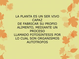Las plantas son seres vivos capaces de fabricar su propio alimento mediante el proceso de fotosíntesis, lo que las hace organismos autotróficos. Están compuestas principalmente de raíces, tallo, hojas, flores y frutos, cada uno con una función específica como la absorción de nutrientes, soporte estructural, producción de alimento y reproducción.