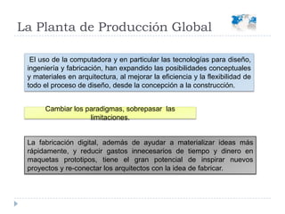 La planta de producción global describe una nueva forma de producción industrial basada en la colaboración en redes flexibles entre empresas y productores autónomos. Se centra en factores clave como procesos de diseño rápidos, arquitecturas modulares y compartir riesgos. También analiza ejemplos como Boeing y BMW que externalizan la fabricación de componentes a proveedores especializados.
