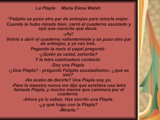 El niño Felipito escucha una voz extraña mientras mira fijamente una letra en su cuaderno con tres pares de anteojos. La letra, una "Plapla", le habla y le dice que es una Plapla, una letra que él mismo escribió que ahora ha cobrado vida y puede caminar en las páginas del cuaderno. Felipito se sorprende porque su maestra nunca le había hablado de una letra llamada Plapla que pudiera moverse, pero la Plapla le explica que ahora él sabe de su existencia.