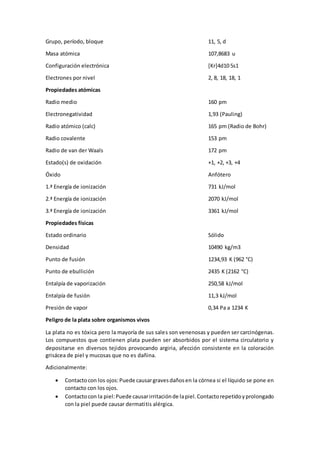 La plata es un metal blanco, brillante y maleable que se encuentra en la naturaleza formando parte de minerales o en forma libre. Tiene usos en fotografía, electrónica, joyería, monedas y como catalizador químico. Los mayores productores mundiales de plata son Perú, China y México, aunque también se produce en países como Chile, Australia, Rusia y Estados Unidos, generalmente como subproducto de la minería de metales como cobre, zinc y plomo.