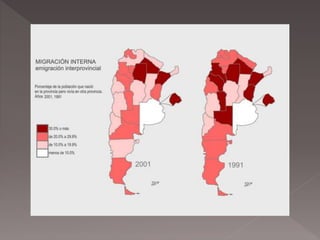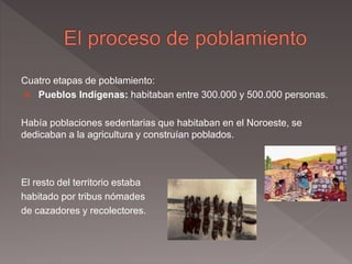 El documento describe las cuatro etapas de poblamiento de Argentina y las principales corrientes migratorias que han contribuido a su población actual. Inicialmente estaba habitada por pueblos indígenas nómadas y sedentarios. Luego llegaron tres corrientes de colonización europea y desde 1810 hubo gran inmigración desde Europa. Desde 1947 predomina la inmigración de países limítrofes. Actualmente la población se concentra en la región pampeana.
