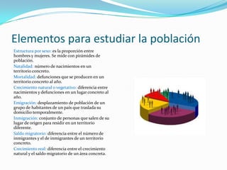 Este documento describe los elementos para estudiar la población de un territorio, incluyendo la estructura por sexo, tasas de natalidad, mortalidad, crecimiento natural, emigración, inmigración y saldo migratorio. También discute los movimientos naturales de población como la natalidad y mortalidad, así como los tipos, causas y efectos de las migraciones.