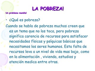 El documento describe la pobreza como una falta de recursos para satisfacer necesidades básicas como alimentación y vivienda. Explica que la pobreza se debe a falta de oportunidades y desigualdad, y que afecta a países del llamado "tercer mundo" donde los salarios no alcanzan para satisfacer necesidades. También enumera estadísticas sobre personas que viven en pobreza extrema y carecen de acceso a servicios básicos, e identifica a los países con mayores tasas de pobreza.