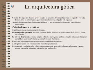 El documento describe la arquitectura y escultura gótica en Europa a finales de la Edad Media. El estilo gótico surgió en Francia en el siglo XII y se caracterizó por el uso del arco apuntado y la bóveda de crucería, que permitieron construir edificios más altos y luminosos. La catedral se convirtió en el centro de las ciudades. La escultura gótica representó temas religiosos de forma más realista y natural, utilizando materiales como la piedra en retablos, sepulcros