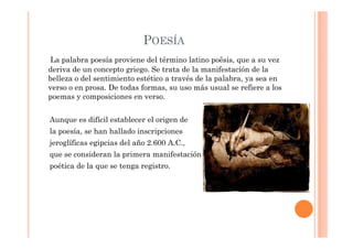 La poesía se refiere a la expresión de la belleza o el sentimiento estético a través de las palabras, generalmente en verso. Se originó en las inscripciones jeroglíficas egipcias del 2600 a.C. Un poema expresa emociones de manera directa en lugar de narrar una historia. La poesía se caracteriza por la introspección, el uso de imágenes y elementos simbólicos, y suele ajustarse a normas formales como los versos, estrofas y métrica. Contiene figuras literarias como la met