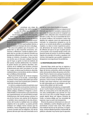 La poesía es un testimonio honesto del tiempo que permite expresar emociones, pensamientos y reflexiones. Escribir poemas requiere depurar el lenguaje y construir imágenes con ritmo, tono y silencios. Leer poesía es una forma de enfrentarse a uno mismo y encontrar respuestas sobre la vida. Los poetas se comprometen a transmitir experiencias de forma transparente a través de su obra, a pesar de que la poesía suele estar al margen del mercado.