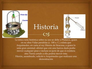 Este documento describe la polea, una máquina simple que sirve para transmitir fuerza. Explica que la polea consiste en una rueda acanalada por la que pasa una cuerda o cable, permitiendo cambiar la dirección del movimiento. También menciona que las poleas pueden combinarse en conjuntos como aparejos o polipastos para reducir la fuerza necesaria para mover un peso. Finalmente, presenta diferentes tipos de poleas como la fija, compuesta, simple, móvil y polipasto.