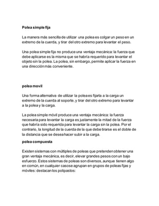La polea es un dispositivo mecánico que sirve para transmitir y reducir la magnitud de una fuerza necesaria para mover un peso. Históricamente, Arquímedes demostró que con poleas podía mover grandes pesos con poca fuerza. Existen poleas simples fijas y móviles, así como polipastos que usan múltiples poleas para obtener mayores ventajas mecánicas y elevar pesos con menor esfuerzo aplicando la fuerza.