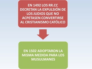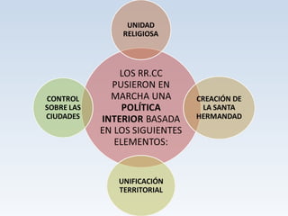 Los Reyes Católicos establecieron el control político del estado moderno a través de corregidores para imponer las decisiones reales en las ciudades, unificaron la religión mediante la Inquisición para controlar a los judíos conversos y moriscos, y expandieron su territorio a través de la conquista del Reino de Granada en 1492 y las exploraciones y conquistas en América.