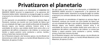 El gobierno de Mauricio Macri tercerizó la administración y ganancias del Planetario Galileo Galilei sin informar a nadie. Dos empleadas despidieron al personal existente y pusieron en cargos de gestión a familiares como yernos, maridos e hijos menores de edad. Ahora el Planetario realiza actividades ajenas a la difusión de la astronomía.