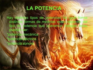 El documento describe diferentes tipos de potencia, incluyendo potencia mecánica, eléctrica y acústica. Explica que la potencia es el trabajo realizado en un periodo de tiempo, y proporciona detalles sobre cómo se mide cada tipo de potencia, incluyendo las unidades involucradas como el caballo de fuerza, el voltio y el decibelio. También describe varios instrumentos comunes para medir magnitudes eléctricas y acústicas como el amperímetro, voltímetro, osciloscopio y sonómetro.