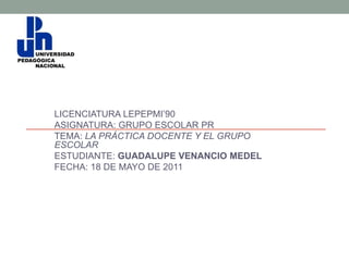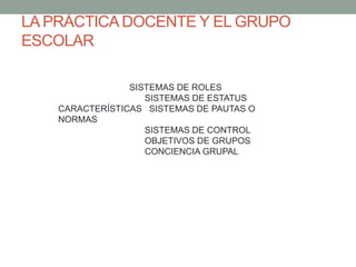 Este documento describe los conceptos de grupo escolar y el rol del maestro. Explica que un grupo está formado por personas que cumplen roles específicos de acuerdo a normas y objetivos acordados. Describe diferentes tipos de grupos como grupos pequeños y grandes, grupos primarios y secundarios. Resalta que el rol del maestro no es solo enseñar sino mediar entre el alumno y el ambiente. También presenta las metas y estándares curriculares para la educación preescolar enfocados en el desarrollo de valores