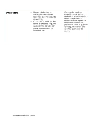 El documento describe las diferentes fases de la práctica educativa y sus características y finalidades. La fase inicial se centra en conocer a cada alumno y planificar actividades de aprendizaje. La fase reguladora se enfoca en adaptarse continuamente a las necesidades de los alumnos. La fase final evalúa los resultados y el proceso de aprendizaje. Finalmente, la fase integradora implica comprender todo el proceso del alumno para establecer nuevas propuestas educativas.