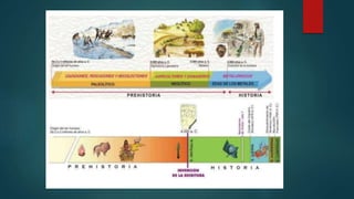 El documento compara el Paleolítico y el Neolítico, las primeras etapas de la antigüedad. El Paleolítico se caracterizó por la caza y recolección, mientras que el Neolítico trajo la agricultura y la cría de animales.