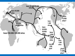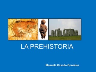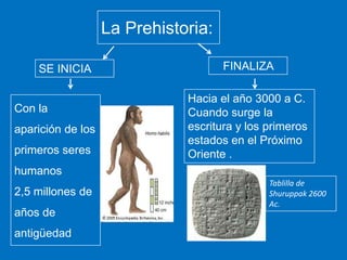 La Prehistoria abarca desde la aparición de los primeros seres humanos hace 2,5 millones de años hasta el 3000 a.C., cuando surge la escritura. Incluye el Paleolítico, donde los humanos eran cazadores-recolectores nómadas, el Neolítico con la aparición de la agricultura y la ganadería, y la Edad de los Metales con el trabajo de metales como el cobre, bronce e hierro. El arte prehistórico incluye pinturas rupestres, esculturas y megalitos como dólmen