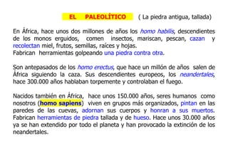 La Prehistoria abarca millones de años desde los primeros seres humanos en la Tierra hasta la invención de la escritura hace unos 5,300 años. Los primeros humanos eran monos que andaban erguidos como los australopitecos. Con el tiempo, sus cerebros triplicaron de tamaño y aprendieron a usar herramientas de piedra. En el Paleolítico cazaban y recolectaban, y los neandertales controlaban el fuego. En el Mesolítico dominaron la caza con arcos. En el Neolítico comenzó la