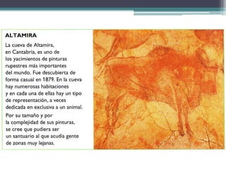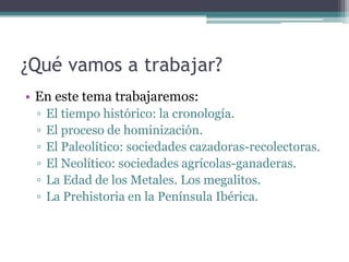 Este documento proporciona una introducción a la Prehistoria. Explica que la Prehistoria abarca desde la aparición del ser humano hace 2.5 millones de años hasta la invención de la escritura hace unos 3500 años. Se divide en la Edad de Piedra y la Edad de los Metales. La Edad de Piedra incluye el Paleolítico, cuando los humanos eran cazadores-recolectores nómadas, y el Neolítico, cuando aprendieron la agricultura y la ganadería y se volvieron sedentarios.