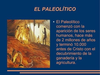 El Paleolítico se inició hace más de 2 millones de años y concluyó en 10.000 a.C., caracterizándose por el nomadismo de los humanos que cazaban, pescaban y recolectaban. En España, se han encontrado importantes restos y pinturas rupestres en cuevas como Altamira y la de la Pileta. Durante este periodo, los pobladores de Andalucía se asentaron en cuevas y orillas de ríos, dejando un legado artístico significativo.