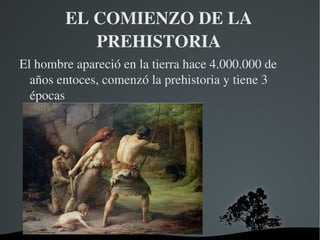 La prehistoria comenzó hace 4 millones de años con la aparición del ser humano y tiene 3 épocas principales: el Paleolítico, en el que los humanos eran cazadores-recolectores nómadas; el Neolítico, cuando descubrieron la agricultura y la ganadería y se volvieron sedentarios; y la Edad de los Metales, cuando empezaron a usar herramientas de cobre, bronce y hierro.