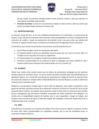 El documento aborda la importancia de la previsión en la administración de empresas, enfatizando la necesidad de preparar soluciones para futuras contingencias relacionadas con la salud y seguridad laboral. Se detallan diversos tipos de previsiones, como económica, contable y de ventas, y se discuten sus beneficios en relación con el bienestar del trabajador y la productividad empresarial. Además, se resalta que la prevención es clave para garantizar la seguridad en el trabajo y disminuir riesgos innecesarios.