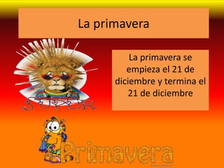 La primavera se inicia el 21 de marzo y finaliza el 21 de junio. El documento habla sobre las fechas de inicio y finalización de la primavera, aunque menciona erróneamente el 21 de diciembre dos veces en lugar del 21 de marzo y el 21 de junio.