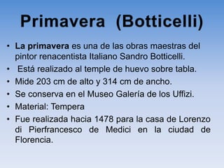 La Primavera de Botticelli es una obra maestra del Renacimiento italiano pintada al temple sobre tabla que mide 203 cm de alto y 314 cm de ancho y se conserva en los Uffizi. Representa la llegada de la primavera con figuras a tamaño natural que muestran gracia y elegancia intelectual. Botticelli se inspiró en las teorías neoplatónicas sobre el amor.