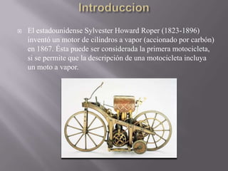 La primera motocicleta fue inventada en 1867 por Sylvester Howard Roper en Estados Unidos y utilizaba un motor de vapor. En 1885, Wilhelm Maybach y Gottlieb Daimler construyeron una motocicleta de cuatro ruedas con motor de combustión interna. Más tarde, en 1876, Nikolaus Otto inventó el primer motor de combustión interna de cuatro tiempos y Gottlieb Daimler lo utilizó para construir otra de las primeras motocicletas de la historia.
