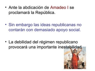 La Primera República española de 1873-1874 sufrió una gran inestabilidad con cuatro presidentes diferentes en un año debido a las divisiones políticas y a los desafíos de la Guerra Carlista, la guerra de Cuba y las sublevaciones cantonales, lo que finalmente llevó a su fin con un golpe militar que allanó el camino para el regreso de la monarquía.