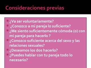 Este documento presenta varias preguntas sobre la primera relación sexual entre parejas, incluyendo si debe ser voluntaria, si la pareja se siente cómoda uno con el otro, si conocen sobre sexo y relaciones, si ambos lo desean, y si pueden hablar abiertamente. También plantea preguntas sobre precauciones, temores comunes, embarazo, dolor, sangrado, vergüenza y la edad apropiada.
