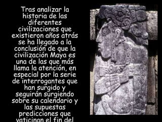 Las siete profecías Mayas predicen cambios climáticos extremos, incluido el derretimiento de los polos que inundará los continentes, y la posible colisión de un cometa con la Tierra. También advierten que la humanidad debe cambiar su conciencia para evitar el caos y encontrar la paz interior antes de 2012, ya que de lo contrario se producirán catástrofes sin precedentes. Los Mayas creen que todo se transformará espiritualmente pero que el planeta y la conciencia humana también cambiarán físicamente.