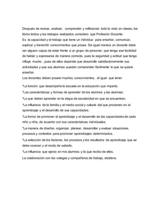 El documento aborda la complejidad de la profesión docente, profundizando en su formación, identidad y los múltiples retos que enfrentan en contextos sociales, económicos y familiares. Se destaca la importancia de la tecnología y la necesidad de que los docentes se adapten a las nuevas herramientas y metodologías educativas, así como la relevancia de la relación con los alumnos y sus familias. Finalmente, se subraya que el futuro docente debe desarrollar habilidades para trabajar con la incertidumbre y promover un aprendizaje activo e inclusivo.