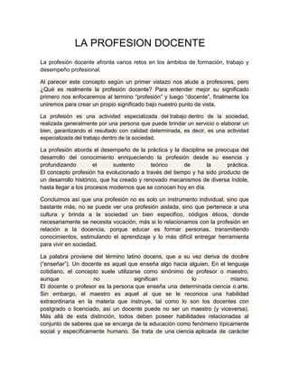La profesión docente implica enseñar y formar personas de manera integral para que puedan desenvolverse en la sociedad. Un docente es aquel que tiene estudios universitarios o superiores en pedagogía y se dedica a transmitir conocimientos a los estudiantes a través de diversas técnicas, con el objetivo de educar de manera de calidad. La profesión docente requiere vocación para poder ayudar a los estudiantes en su aprendizaje y desarrollo personal.