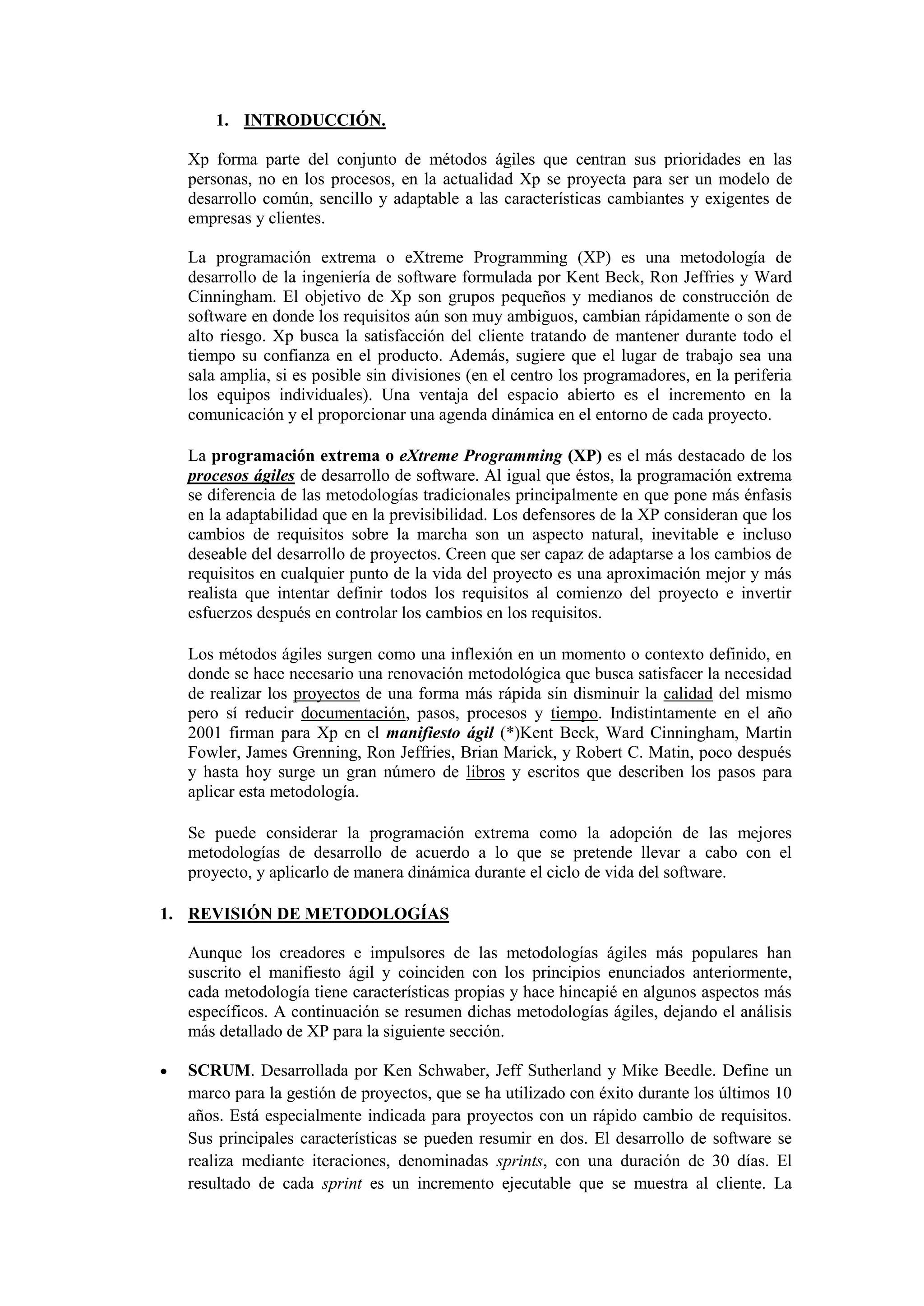Este documento describe la metodología de desarrollo de software conocida como Programación Extrema o eXtreme Programming (XP). XP se centra en satisfacer al cliente, manteniendo su confianza a través de comunicación constante y cambios rápidos de requisitos. Utiliza historias de usuario en tarjetas para especificar requisitos de forma flexible, y roles como programadores, clientes y propietarios de historias. El documento compara XP con otras metodologías ágiles como Scrum y Crystal y describe prácticas clave de XP como desarrollo por pares,