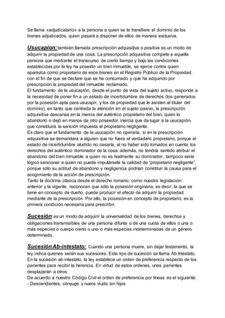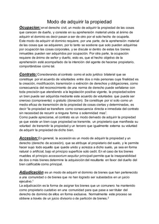 El documento describe varios modos de adquirir la propiedad, incluyendo la ocupación, el contrato, la accesión, la adjudicación, la usucapión, la sucesión y las limitaciones a la propiedad privada. También explica conceptos como la posesión, la protección a la posesión y la propiedad horizontal.
