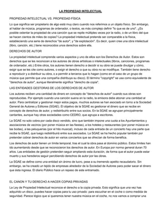 La propiedad intelectual establece derechos sobre obras creativas como música, libros y programas. Los autores tienen derechos de autor que les permiten controlar cómo se usa y distribuye su trabajo. Las entidades como la SGAE gestionan el pago de derechos de autor cuando las obras se usan públicamente. Aunque la ley permite copias privadas, también establece un canon que se paga por dispositivos de almacenamiento para compensar a los autores.