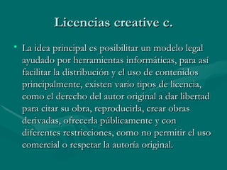 Este documento explica las licencias Creative Commons, las cuales permiten que los autores especifiquen cómo otros pueden usar y compartir su trabajo. Describe los seis tipos de licencias CC y sus condiciones, como permitir el uso comercial o la creación de obras derivadas. También resume los conceptos de uso justo y dominio público, así como los derechos morales y patrimoniales relacionados con el copyright.