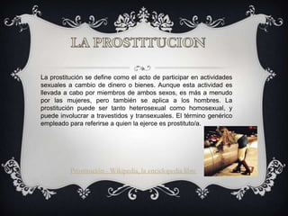 La prostitución se define como el intercambio de favores sexuales por dinero u otros bienes materiales. Aunque es ejercida por ambos sexos, suele ser más común entre las mujeres. En muchos países es ilegal y está relacionada con delitos como la trata de personas y la explotación sexual, especialmente de mujeres y niños. Las Naciones Unidas trabajan para combatir estas problemáticas globales en torno a la prostitución.