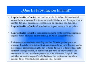 Este documento habla sobre la prostitución infantil, definida como actos sexuales entre un menor de 18 años y un adulto a cambio de bienes. Explica que la prostitución infantil está prohibida en la mayoría de países y ocurre principalmente por pobreza extrema. Menciona que factores como necesidades económicas, abandono del hogar, drogadicción y explotación por proxenetas obligan a los menores a prostituirse, lo que trae consecuencias como drogadicción, suicidio y depresión. También señala que la