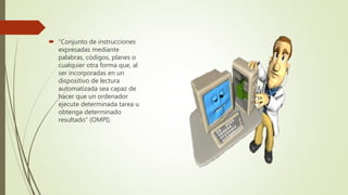 El documento habla sobre la protección jurídica del software y los derechos de propiedad intelectual. Define el software como un conjunto de instrucciones expresadas en palabras, códigos o planes que permiten a una computadora ejecutar tareas u obtener resultados. Explica que tanto el código fuente como el objeto de los programas de computación están protegidos por los derechos de autor como obras literarias de acuerdo con el Convenio de Berna y otros acuerdos internacionales como la Directiva 91/250/CEE y el artículo 1705 del TLCAN.