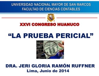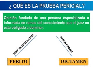 Este documento presenta un resumen de la prueba pericial en el ámbito legal. Explica que la prueba pericial es una opinión de un experto que provee verificación e información técnica para ayudar al juez. Detalla los aspectos, procedimientos y comparaciones con otras pruebas legales de la prueba pericial según los códigos procesales civil y penal peruano. Finalmente, incluye un ejemplo de cálculo de intereses de una deuda usando una prueba pericial.