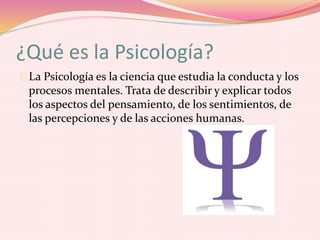 El documento resume los conceptos fundamentales de la psicología. Define la psicología como la ciencia que estudia la conducta y los procesos mentales humanos. Explica que su objeto de estudio son los procesos psíquicos y mentales. También describe las principales escuelas psicológicas como el estructuralismo, funcionalismo, psicoanálisis, conductismo, gestalt, cognitivismo, humanismo y constructivismo. Por último, resalta algunos de los campos de estudio de la psicología como la experimental, social, evolut