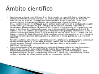 La psicología estudia la conducta y comportamientos humanos. Se enmarca entre las ciencias naturales, sociales y humanas. Existen diferentes escuelas como el conductismo, cognitivismo y psicoanálisis. Utiliza métodos cuantitativos y cualitativos para investigar procesos cognitivos, afectivos y de comportamiento. Los psicólogos se organizan en colegios profesionales y asociaciones científicas a nivel local, nacional e internacional.