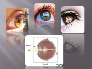 El documento describe las principales partes del ojo humano y cómo funciona la visión. Explica que los rayos de luz entran en el ojo a través de la córnea y pasan a través del cristalino, que actúa como una lente convergente, formando una imagen invertida en la retina. Luego, los impulsos nerviosos son transmitidos al cerebro a través del nervio óptico para producir la sensación de visión. También describe cómo el iris regula la cantidad de luz que entra variando el tamaño de la pupila y cómo el