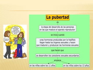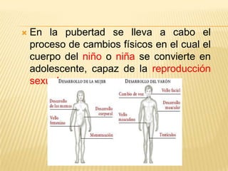 El documento describe los cambios físicos y emocionales que ocurren durante la pubertad y la adolescencia. En la pubertad, el cuerpo experimenta cambios como el crecimiento del vello corporal, los senos en las niñas y los testículos en los niños. También se producen la menstruación en las niñas y la eyaculación en los niños. En la adolescencia, continúan los cambios físicos y también se desarrolla la identidad personal y la capacidad emocional.