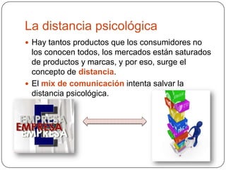 Este documento habla sobre conceptos clave de la publicidad como la distancia psicológica entre consumidores y productos, y el uso del mix de comunicación para reducir esa distancia. Explica diferentes tipos de publicidad y soportes publicitarios como diarios, radio y televisión. También describe elementos importantes de un anuncio publicitario como el slogan, mensaje, marca y música.