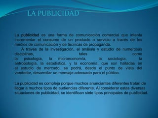 El documento describe los conceptos clave de publicidad, mercadeo y sus relaciones. Explica que la publicidad intenta incrementar el consumo a través de los medios de comunicación, mientras que el mercadeo incluye todas las actividades para promover un producto desde su concepción hasta su venta regular. También cubre los tipos de publicidad, la importancia de la publicidad, los medios publicitarios, el mercado, y la relación entre publicidad y mercadeo.