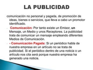 La publicidad es una comunicación pagada que promueve ideas, bienes o servicios de un promotor identificado. Incluye un emisor, mensaje, medio y receptores. Los anunciantes incluyen empresas, organizaciones sin fines de lucro y gobiernos. Los medios de comunicación como televisión, prensa e internet transmiten los mensajes publicitarios a audiencias objetivo. Las agencias de publicidad crean los anuncios. La publicidad tiene como objetivo aumentar las ventas, conocimiento de marca e imagen.