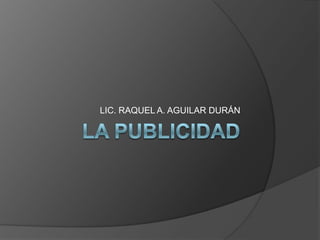 El documento define la publicidad como un esfuerzo pagado para transmitir mensajes persuasivos a través de medios masivos con el objetivo de promover ideas, productos o servicios. Explica que la publicidad tiene objetivos generales como informar, persuadir o recordar, así como objetivos específicos como respaldar ventas, introducir nuevos productos o contrarrestar sustituciones. Finalmente, describe diferentes tipos de publicidad según la audiencia, el mensaje o la fuente del anuncio.
